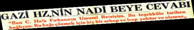 "Mesela o dönemde 5 kuruşa satılan Cumhuriyet gazetesinin 10 Eylül 1930 günkü nüshasının birinci sayfasındaki manşet "Gazi Hazretlerinin Nadi Bey'e cevabı" şeklinde... Bu cevabında Gazi "Ben Cumhuriyet Halk Fırkası'nın Umumi Reisiyim. Bu teşekkülle tarihen bağlıyım. Bu bağı çözmek için hiçbir sebep yoktur ve olamaz" diyor. "Gazi"nin Atatürk, "Nadi Bey"in Yunus Nadi, "Umumi Reis"in Genel Başkan ve "Cumhuriyet Halk Fırkası"nın CHP olduğunu öğrenmek için de arama motorlarına girenler herhalde olacaktır."