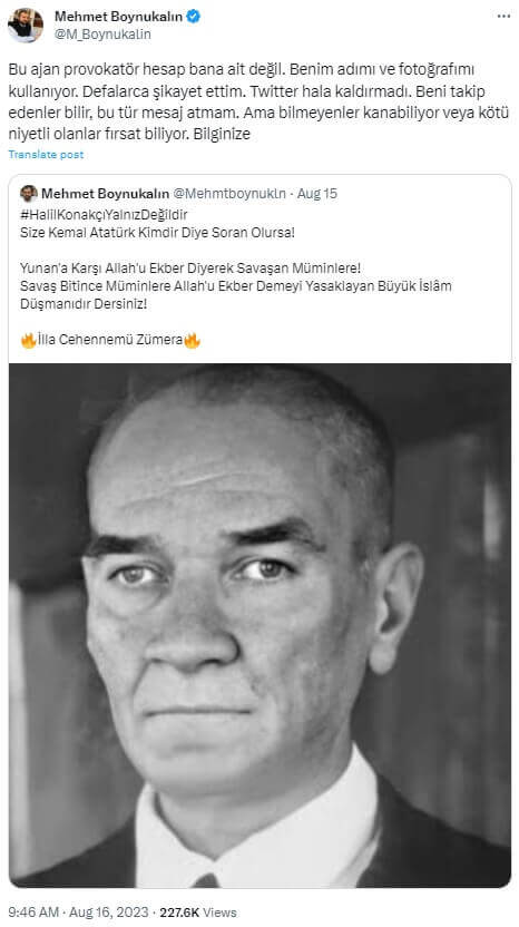 “Size Kemal Atatürk kimdir diye soran olursa! Yunan’a karşı Allah’u Ekber diyerek savaşan müminlere! Savaş bitince müminlere Allah’u Ekber demeyi yasaklayan büyük İslâm düşmanıdır dersiniz!” ifadelerini paylaşan Twitter hesabı Mehmet Boynukalın’a ait değil