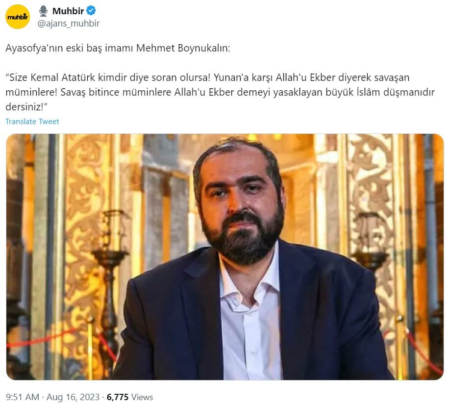 Muhbir (@ajans_muhbir): “Ayasofya’nın eski baş imamı Mehmet Boynukalın: ‘Size Kemal Atatürk kimdir diye soran olursa! Yunan’a karşı Allah’u Ekber diyerek savaşan müminlere! Savaş bitince müminlere Allah’u Ekber demeyi yasaklayan büyük İslâm düşmanıdır dersiniz!'”