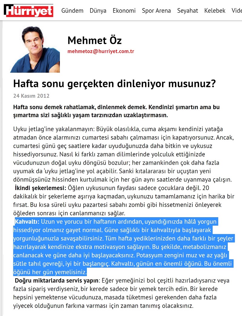 Örneğin, Mehmet Öz’ün Hürriyet’te yayınlanan “İşte sihirli kahvaltı formüllerim” başlıklı 27 Ekim 2013 tarihli yazısında kahvaltı yapmadan güne başlanmaması gerektiğini belirttiği görülüyor: