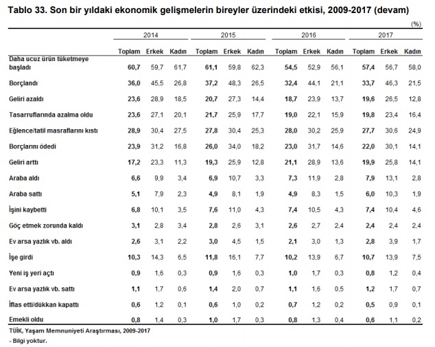 İlaveten, TÜİK’in internet sitesinde yer alan “Yaşam Memnuniyeti Araştırması 2013-2017” başlıklı raporun 49 ve 50. sayfalarında yer alan “Son bir yıldaki ekonomik gelişmelerin bireyler üzerindeki etkisi” başlıklı 33 nolu tabloda Mehmet Tezkan’ın bulamadığı veriler yer almaktadır.