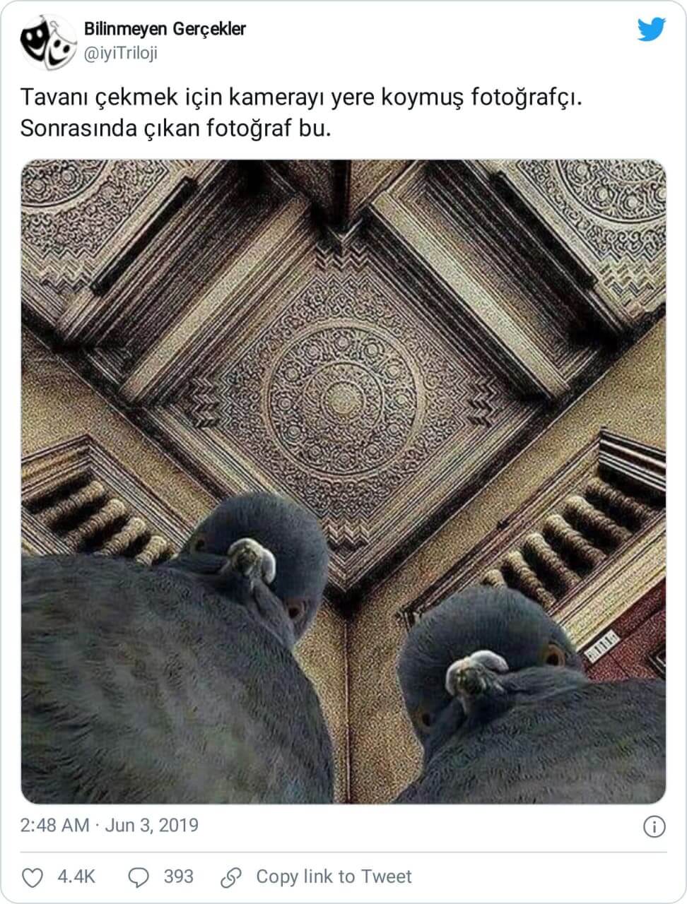 Harikulade işlemeye sahip tavanın fotoğrafını çekmeye çalışan bir fotoğrafçının kadrajına meraklı iki güvercinin girdiği anda kaydedildiği öne sürülen görsele mutlaka denk gelmişsinizdir.