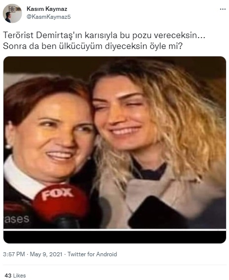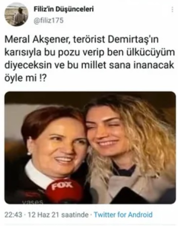 İYİ Parti Genel Başkanı Meral Akşener’in İstanbul Büyükşehir Belediye Başkanı Ekrem İmamoğlu’nun eşi Dilek İmamoğlu’nun birlikte yer aldığı görselin sosyal medyada “eee olcağı bu demirtasin hanimiyla beraber” ya da “Terörist Demirtaş’ın karısıyla bu pozu vereceksin… Sonra da ben ülkücüyüm diyeceksin öyle mi?” gibi notlarla paylaşıldığı görülüyor.