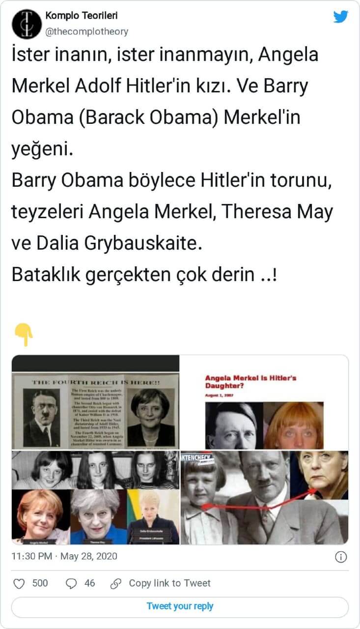 “İster inanın, ister inanmayın, Angela Merkel Adolf Hitler’in kızı. Ve Barry Obama (Barack Obama) Merkel’in yeğeni. Barry Obama böylece Hitler’in torunu, teyzeleri Angela Merkel, Theresa May ve Dalia Grybauskaite. Bataklık gerçekten çok derin ..!