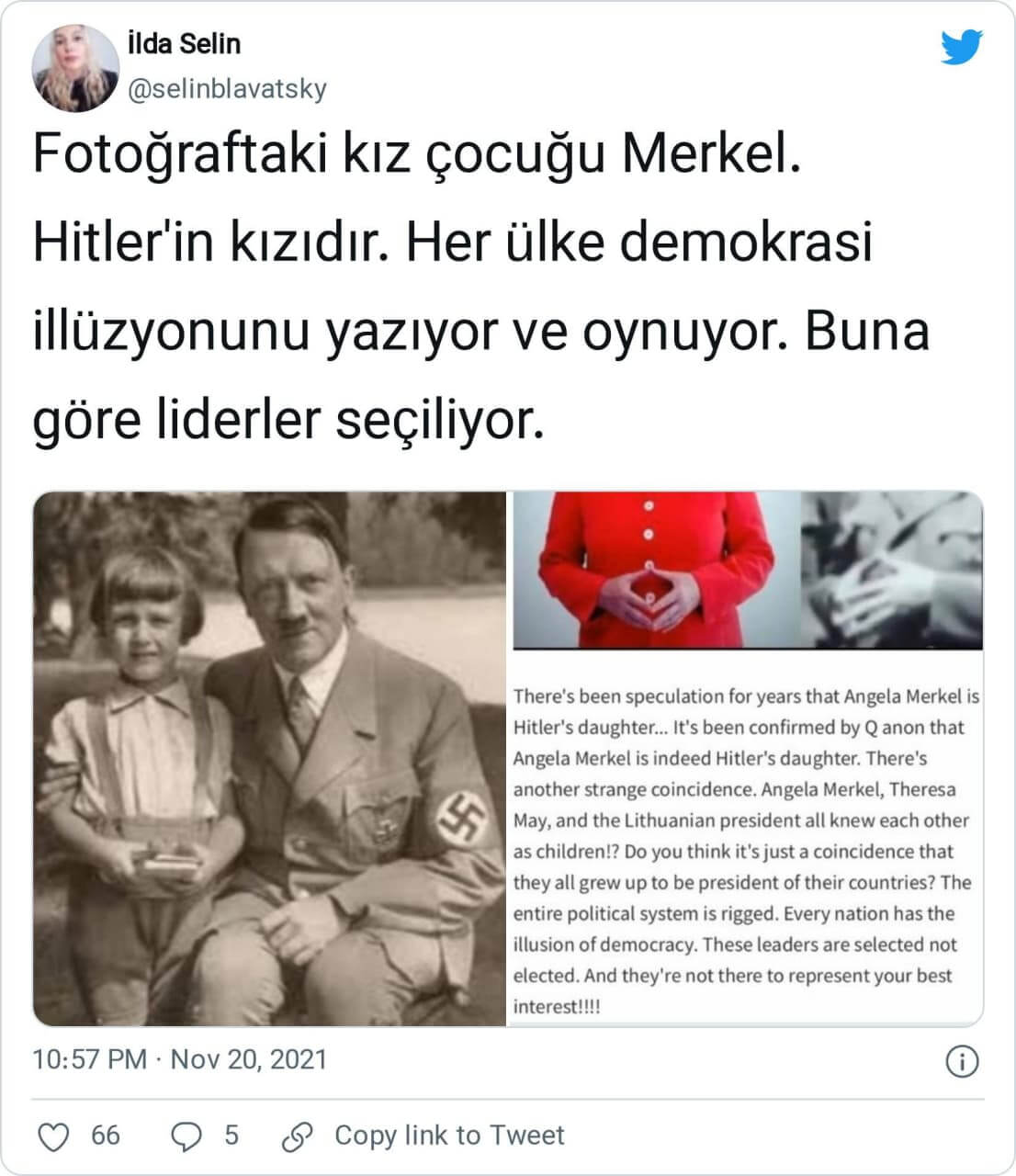“Fotoğraftaki kız çocuğu Merkel. Hitler’in kızıdır. Her ülke demokrasi illüzyonunu yazıyor ve oynuyor. Buna göre liderler seçiliyor.”