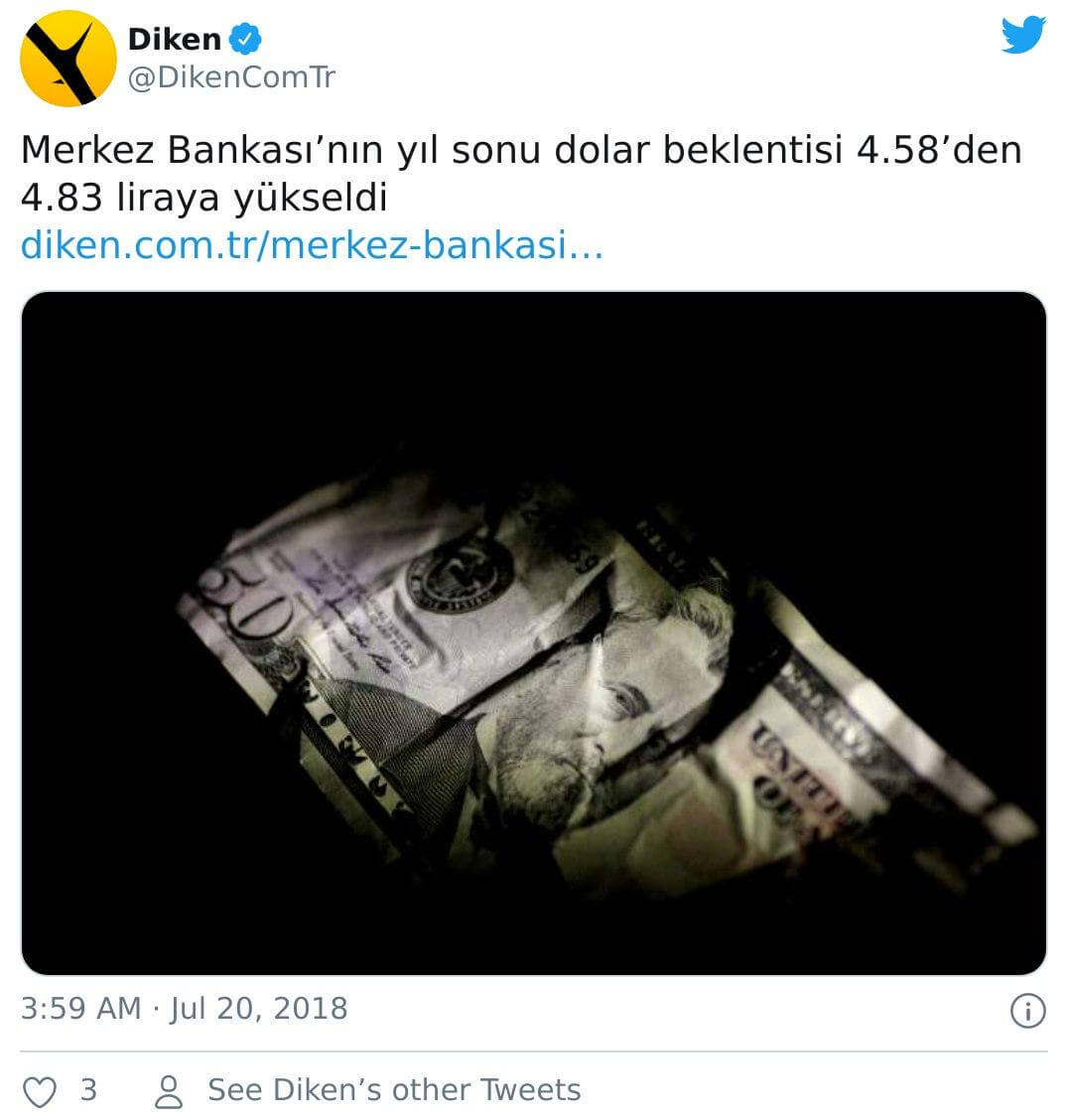 Diken’in Merkez Bankası Beklenti Anketi sonuçlarını Merkez Bankası’nın yıl sonu dolar beklentisi olarak yanlış şekilde aktardığı paylaşımı