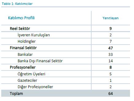 Anketin katılımcıları “Finansal ve reel sektörde karar alıcı ve uzman kişiler ile profesyonellerdir.”. Beklenti Anketi, her ay itibarıyla 67 ’sı finansal sektör, 10 ’u reel sektör, 13 ’ü ise profesyonellerden oluşan 90 katılımcıya gönderilmektedir. Katılımcıların sunduğu yanıtların “uygun ortalaması” alınarak toplulaştırılıp kamuoyuyla paylaşılmaktadır.