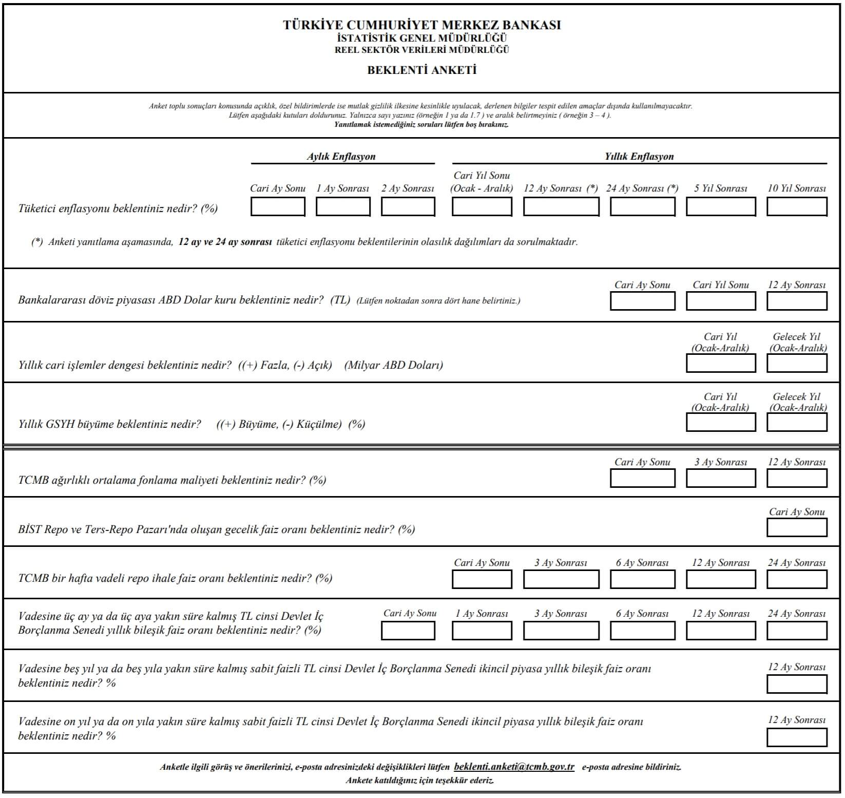 Merkez Bankası İstatistik Genel Müdürlüğü Reel Sektör Verileri Müdürlüğü tarafından beklenti anketi soru formu aracılığıyla katılımcılardan aşağıdaki başlıklardaki ekonomik göstergelere ilişkin beklentilerini aktarması talep edilmektedir: