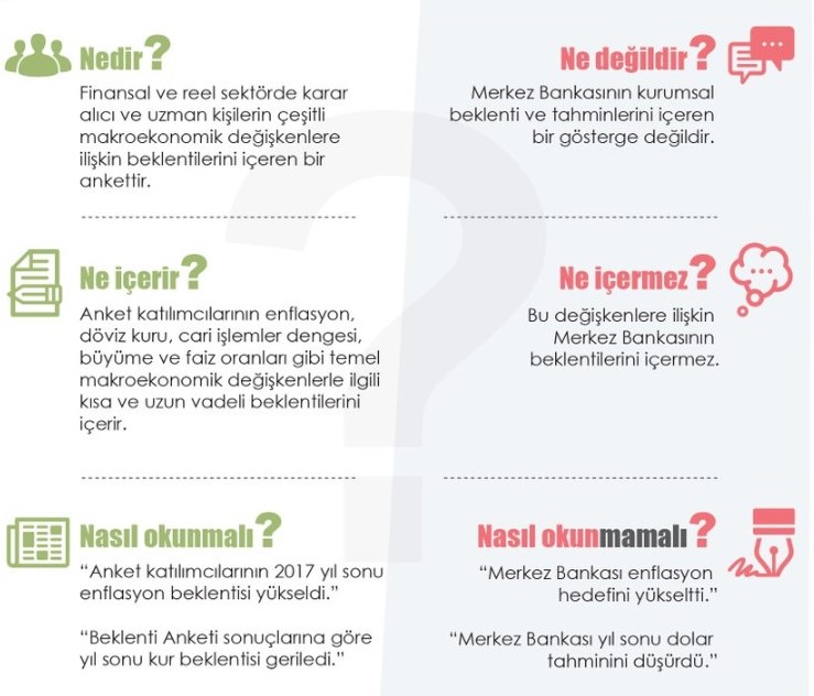 Bu konudaki kafa karışıklığını gidermek ve yanlış anlaşılmaların önüne geçmek için Merkez Bankası tarafından da çaba gösterilmektedir. Bu yönde hazırlanan metin ve görseller ile söz konusu beklenti anketinin Merkez Bankası’nın tahminleri olmadığı gibi, hedeflerini de göstermediği hususu kamuoyuyla paylaşılmaktadır.