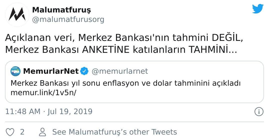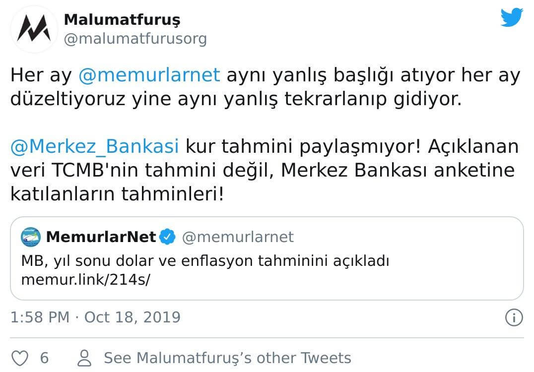 Bu yanlışı düzeltmek ve farkındalık oluşturmak adına sosyal medya hesaplarımız üzerinden “açıklanan verinin Merkez Bankası’nın tahmini DEĞİL, Merkez Bankası ANKETİNE katılanların TAHMİNİ” olduğunu belirten birçok uyarı mahiyetinde paylaşımda bulunmuştuk.