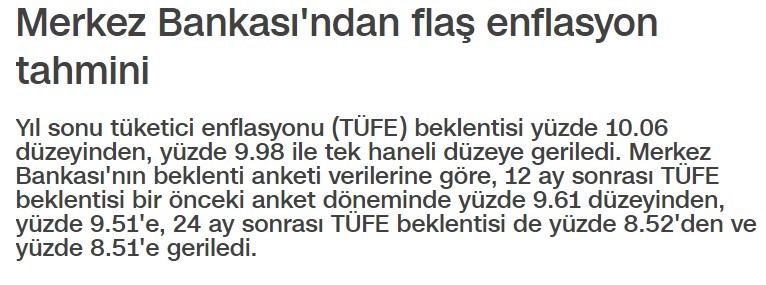 “Merkez Bankası’ndan flaş enflasyon tahmini” başlığı ile verilen haberin metninde genellikle açıklanan verilerin Merkez Bankası’nın beklenti anketi verileri olduğu ifade edilmektedir. Ancak yanıltıcı başlığın etkisiyle, bu konuya özel ilgi duymayan okurların ve sosyal medya kullanıcılarının söz konusu tahminlerin TCMB’nin kurumsal enflasyon beklentisi olduğunu düşünmesi kaçınılmaz hâle gelmektedir.