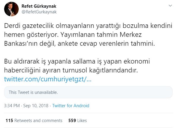 Derdi gazetecilik olmayanların yarattığı bozulma kendini hemen gösteriyor. Yayımlanan tahmin Merkez Bankası’nın değil, ankete cevap verenlerin tahmini.