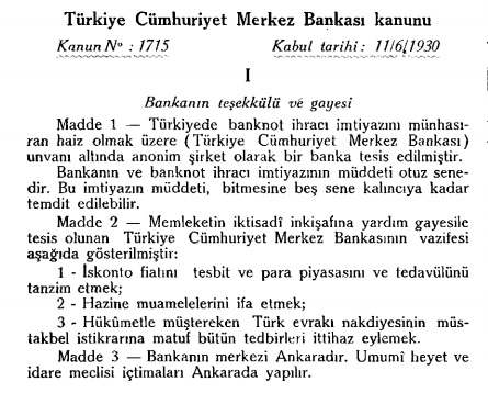 Merkez Bankası, 11 Haziran 1930 tarihli ve 1715 sayılı “Türkiye Cumhuriyet Merkez Bankası Kanunu” ile 150.000 hisseden oluşan 15.000.000 TL sermayeli bir anonim şirket olarak kurulmuştur.