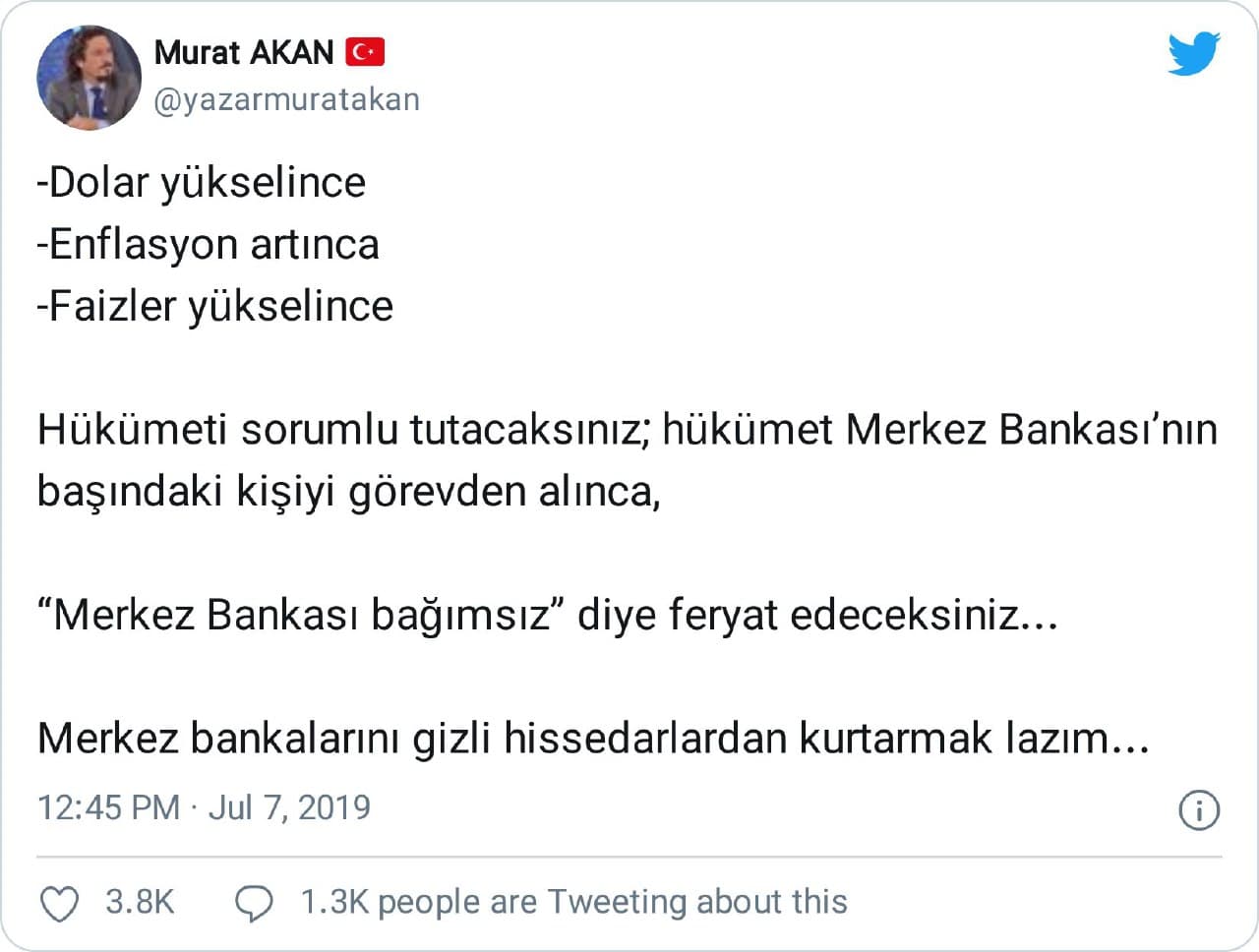 -Dolar yükselince -Enflasyon artınca -Faizler yükselince Hükümeti sorumlu tutacaksınız; hükümet Merkez Bankası’nın başındaki kişiyi görevden alınca, “Merkez Bankası bağımsız” diye feryat edeceksiniz… Merkez bankalarını gizli hissedarlardan kurtarmak lazım…