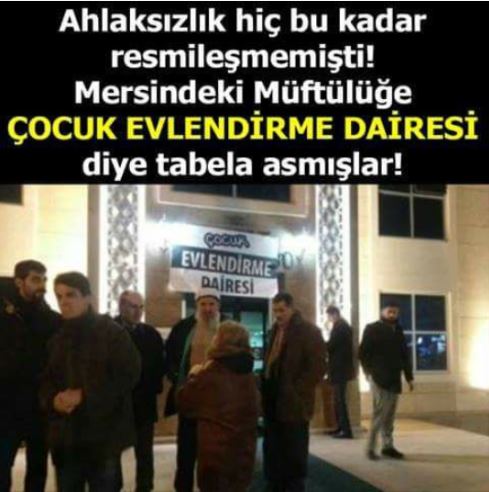 Sosyal medyada yaygın şekilde paylaşıldığı görülen, 2016 yılında çekilen fotoğrafı ve “Ahlaksızlık hiç bu kadar resmileşmemişti! Mersindeki Müftülüğe ÇOCUK EVLENDİRME DAİRESİ diye tabela asmışlar” notunu içeren görsel şu şekilde: