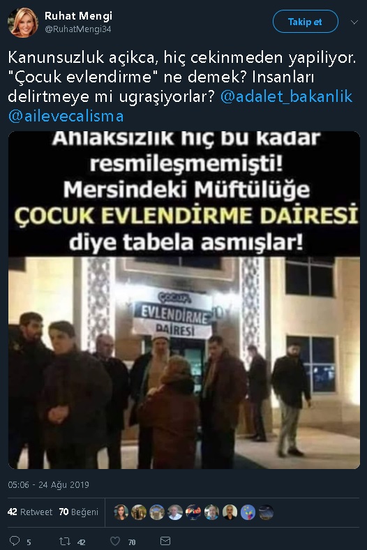 Vatan Gazetesi eski köşe yazarı Ruhat Mengi, Twitter hesabından 24 Ağustos 2019 tarihinde yaptığı bir paylaşımda Mersin Müftülüğü’ne çocuk evlendirme dairesi tabelası asıldığı yönündeki asılsız iddiaya yer vermişti: