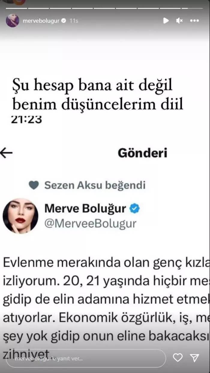 Merve Boluğur, şahsına ait sanılan hesaba dair Instagram hesabında yayımladığı açıklamada “Şu hesap bana ait değil. Benim düşüncelerim değil” ifadelerine yer verdi.
