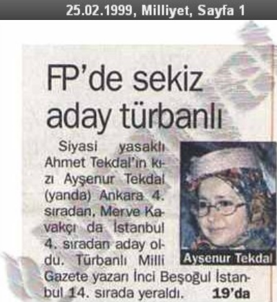Milliyet gazetesinde de 25 Şubat 1999 tarihli “FP’de sekiz aday türbanlı” başlıklı haberde Merve Kavakçı’nın türbanlı olduğu ve İstanbul 4. sıradan milletvekili adayı olduğu belirtilmişti.