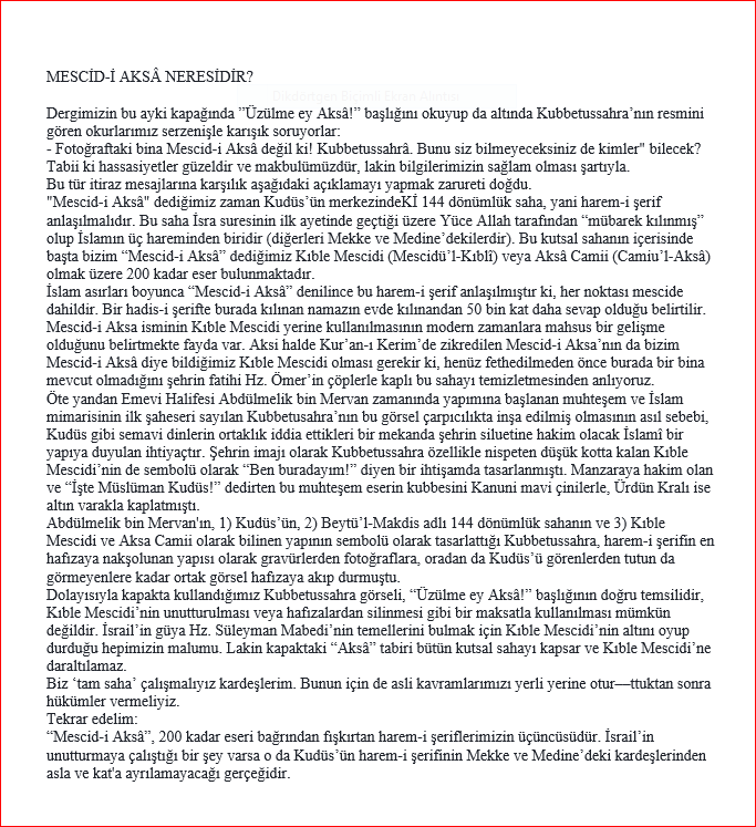 Dergimizin bu ayki kapağında ”Üzülme ey Aksâ!” başlığını okuyup da altında Kubbetussahra’nın resmini gören okurlarımız serzenişle karışık soruyorlar:– Fotoğraftaki bina Mescid-i Aksâ değil ki! Kubbetussahrâ. Bunu siz bilmeyeceksiniz de kimler” bilecek?Tabii ki hassasiyetler güzeldir ve makbulümüzdür, lakin bilgilerimizin sağlam olması şartıyla.Bu tür itiraz mesajlarına karşılık aşağıdaki açıklamayı yapmak zarureti doğdu.“Mescid-i Aksâ” dediğimiz zaman Kudüs’ün merkezindeKİ 144 dönümlük saha, yani harem-i şerif anlaşılmalıdır. Bu saha İsra suresinin ilk ayetinde geçtiği üzere Yüce Allah tarafından “mübarek kılınmış” olup İslamın üç hareminden biridir (diğerleri Mekke ve Medine’dekilerdir). Bu kutsal sahanın içerisinde başta bizim “Mescid-i Aksâ” dediğimiz Kıble Mescidi (Mescidü’l-Kıblî) veya Aksâ Camii (Camiu’l-Aksâ) olmak üzere 200 kadar eser bulunmaktadır.İslam asırları boyunca “Mescid-i Aksâ” denilince bu harem-i şerif anlaşılmıştır ki, her noktası mescide dahildir. Bir hadis-i şerifte burada kılınan namazın evde kılınandan 50 bin kat daha sevap olduğu belirtilir.Mescid-i Aksa isminin Kıble Mescidi yerine kullanılmasının modern zamanlara mahsus bir gelişme olduğunu belirtmekte fayda var. Aksi halde Kur’an-ı Kerim’de zikredilen Mescid-i Aksa’nın da bizim Mescid-i Aksâ diye bildiğimiz Kıble Mescidi olması gerekir ki, henüz fethedilmeden önce burada bir bina mevcut olmadığını şehrin fatihi Hz. Ömer’in çöplerle kaplı bu sahayı temizletmesinden anlıyoruz.Öte yandan Emevi Halifesi Abdülmelik bin Mervan zamanında yapımına başlanan muhteşem ve İslam mimarisinin ilk şaheseri sayılan Kubbetusahra’nın bu görsel çarpıcılıkta inşa edilmiş olmasının asıl sebebi, Kudüs gibi semavi dinlerin ortaklık iddia ettikleri bir mekanda şehrin siluetine hakim olacak İslamî bir yapıya duyulan ihtiyaçtır. Şehrin imajı olarak Kubbetussahra özellikle nispeten düşük kotta kalan Kıble Mescidi’nin de sembolü olarak “Ben buradayım!” diyen bir ihtişamda tasarlanmıştı. Manzaraya hakim olan ve “İşte Müslüman Kudüs!” dedirten bu muhteşem eserin kubbesini Kanuni mavi çinilerle, Ürdün Kralı ise altın varakla kaplatmıştı.Abdülmelik bin Mervan’ın, 1) Kudüs’ün, 2) Beytü’l-Makdis adlı 144 dönümlük sahanın ve 3) Kıble Mescidi ve Aksa Camii olarak bilinen yapının sembolü olarak tasarlattığı Kubbetussahra, harem-i şerifin en hafızaya nakşolunan yapısı olarak gravürlerden fotoğraflara, oradan da Kudüs’ü görenlerden tutun da görmeyenlere kadar ortak görsel hafızaya akıp durmuştu.Dolayısıyla kapakta kullandığımız Kubbetussahra görseli, “Üzülme ey Aksâ!” başlığının doğru temsilidir, Kıble Mescidi’nin unutturulması veya hafızalardan silinmesi gibi bir maksatla kullanılması mümkün değildir. İsrail’in güya Hz. Süleyman Mabedi’nin temellerini bulmak için Kıble Mescidi’nin altını oyup durduğu hepimizin malumu. Lakin kapaktaki “Aksâ” tabiri bütün kutsal sahayı kapsar ve Kıble Mescidi’ne daraltılamaz.Biz ‘tam saha’ çalışmalıyız kardeşlerim. Bunun için de asli kavramlarımızı yerli yerine oturttuktan sonra hükümler vermeliyiz.Tekrar edelim:“Mescid-i Aksâ”, 200 kadar eseri bağrından fışkırtan harem-i şeriflerimizin üçüncüsüdür. İsrail’in unutturmaya çalıştığı bir şey varsa o da Kudüs’ün harem-i şerifinin Mekke ve Medine’deki kardeşlerinden asla ve kat’a ayrılamayacağı gerçeğidir.”