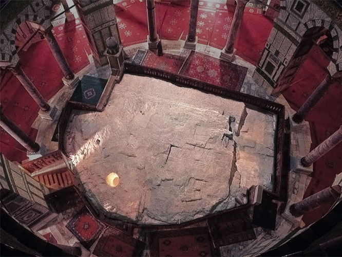 Müslümanlar ve Yahudiler tarafından kutsal kabul edilen “havada asılı duran kaya” anlamına gelen Hacer-i Muallak (muallak taşı), Kubbet-üs Sahra’nın altında yer almaktadır. İslâmî kaynaklara göre Hz. Muhammed miraca bu kaya parçası üzerinden yükselmiştir. Yine bir iddia, muallak taşının havada durduğunu aktarırken, bu inancın İslamiyet’le alakası olmadığını savunan görüşler de mevcuttur.
