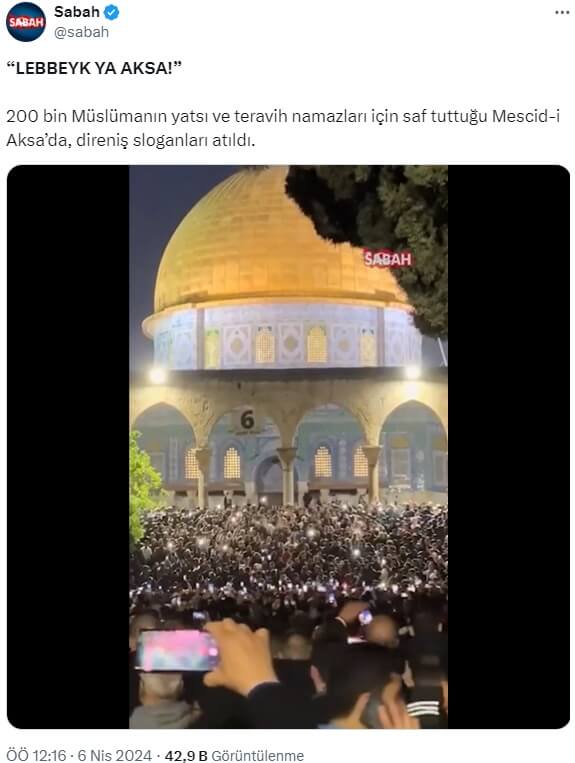 Sabah gibi haber kuruluşlarının 200 bin Müslümanın yatsı ve teravih namazları için saf tuttuğu Mescid-i Aksa’da, direniş sloganları atıldığı iddiasıyla paylaştığı görüntüdeye “Lebbeyk Ya Aksa” sloganı sonradan eklenmiş.