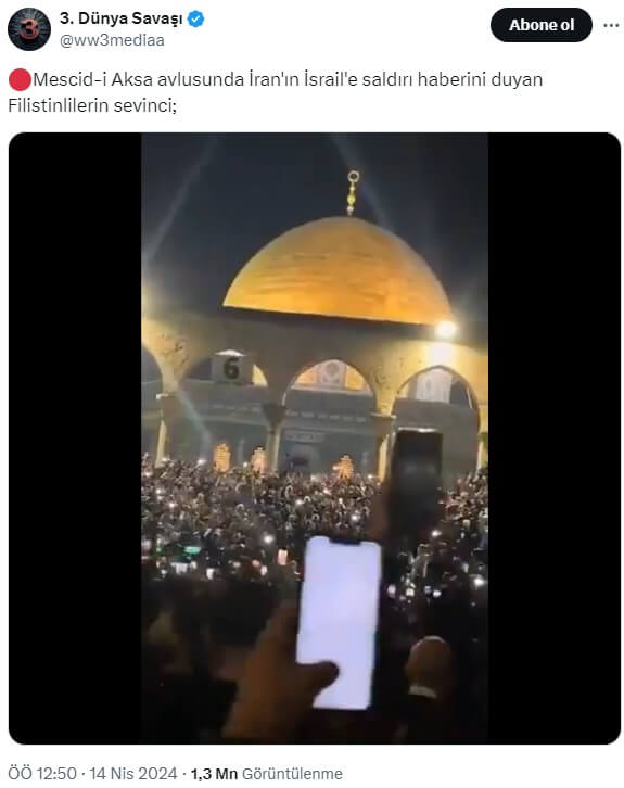 3. Dünya Savaşı (@ww3mediaa): “Mescid-i Aksa avlusunda İran’ın İsrail’e saldırı haberini duyan Filistinlilerin sevinci;”