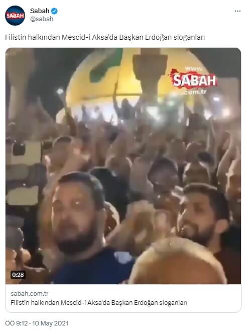 Mescid-i Aksâ’da Cumhurbaşkanı Erdoğan’ın seçim zaferinin kutlandığı iddiasıyla paylaşılan söz konusu görüntü 2021 yılında “Kudüs’te Türkiye ve Erdoğan sesleri yükseldi” ya da “Filistin halkından Mescid-i Aksâ’da Başkan Erdoğan sloganları” gibi başlıklarla haberleştirilmişti.