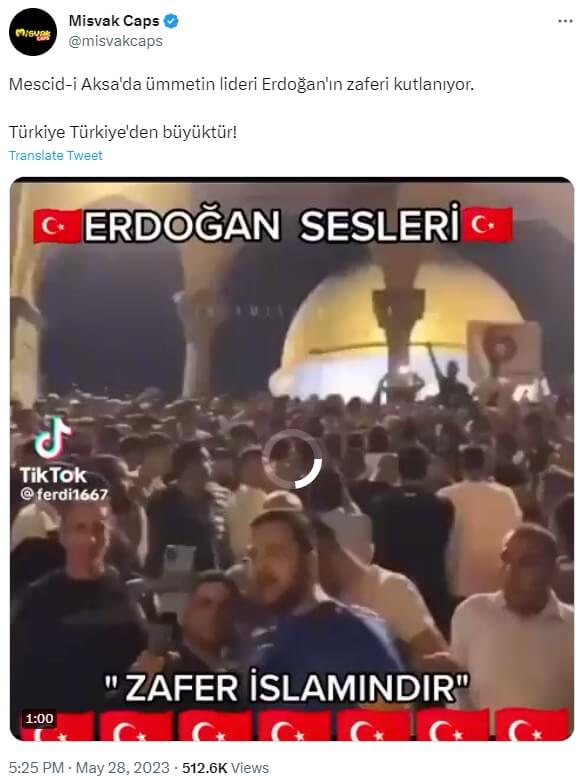28 Mayıs 2023 günü Cumhurbaşkanı seçiminin 2. turunu Cumhurbaşkanı Recep Tayyip Erdoğan’ın kazanmasının ardından Mescid-i Aksâ‘da yapılan kutlamalara ait olduğu iddiasıyla eski tarihli ilintisiz görüntülerin haber sitelerinde ve sosyal medya platformlarında paylaşıldığı görüldü.