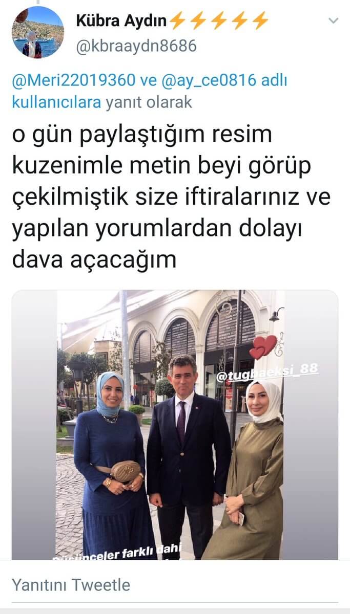 1) Benim sosyal medyamdan alınmış, yandaki diğer kişi kesilerek üzerine bu iftira içerikli yazı yazılmış fotoğrafta, adını bilemediğim bu hanımefendinin kişilik haklarının zarar görmemesi için yüzünü biz buğuladık. Sorumluların bulunması için de yasal süreci pazartesi başlatıyoruz.”