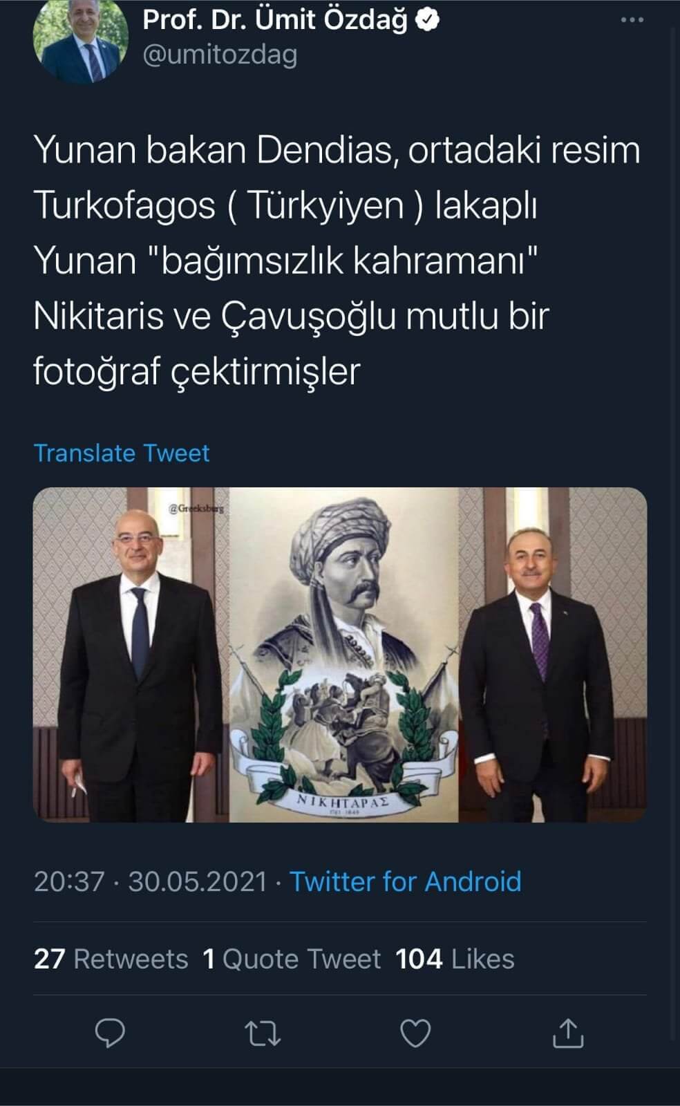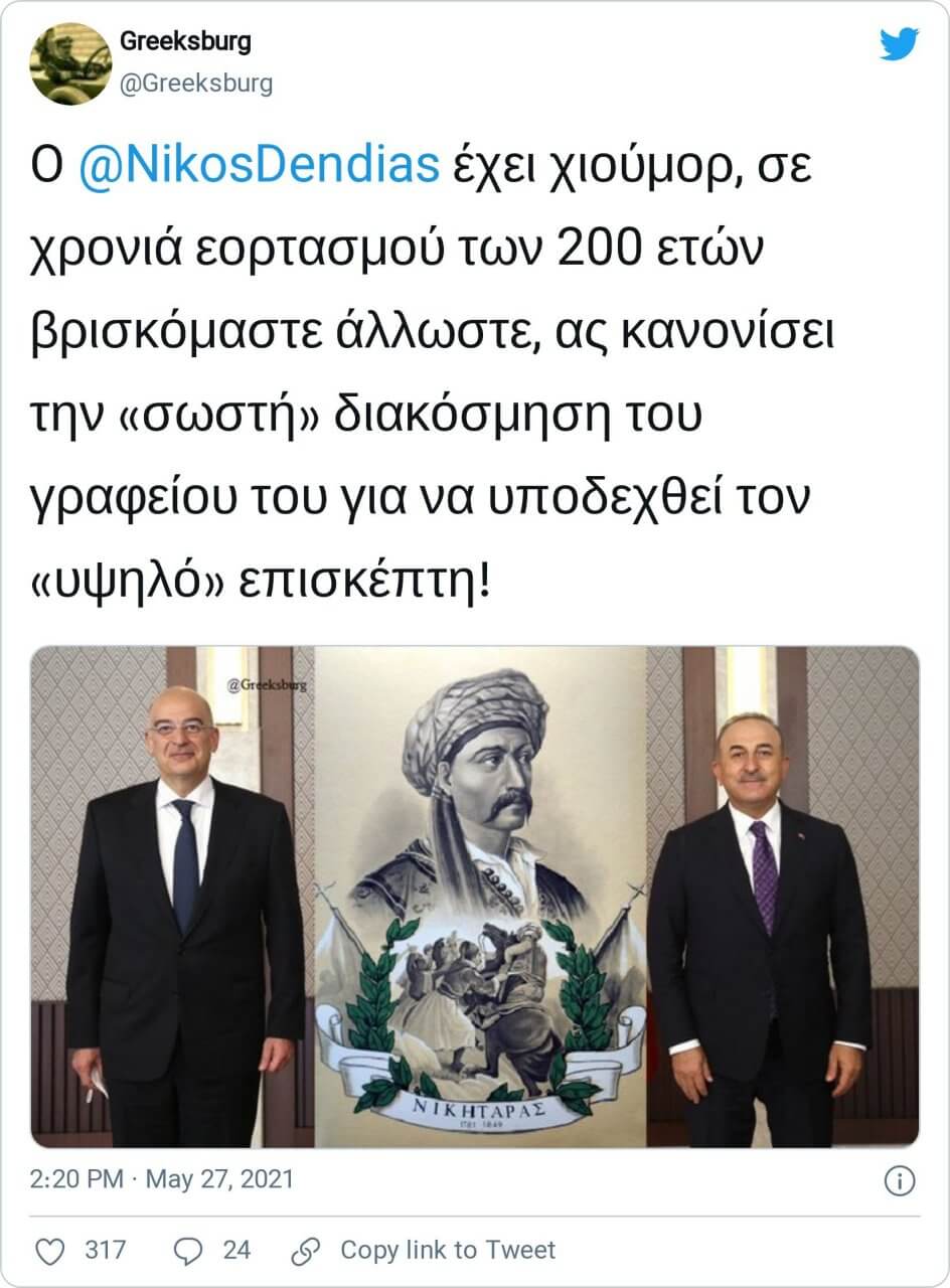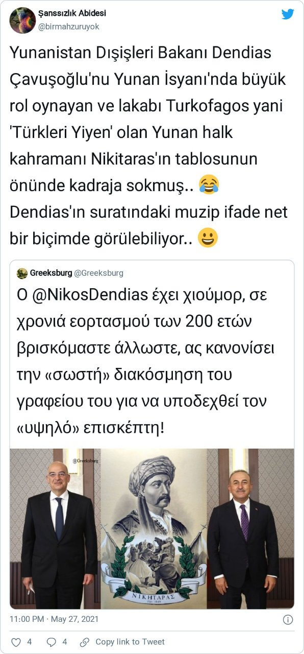 “Yunanistan Dışişleri Bakanı Dendias Çavuşoğlu’nu Yunan İsyanı’nda büyük rol oynayan ve lakabı Turkofagos yani ‘Türkleri Yiyen’ olan Yunan halk kahramanı Nikitaras’ın tablosunun önünde kadraja sokmuş.. Dendias’ın suratındaki muzip ifade net bir biçimde görülebiliyor..”