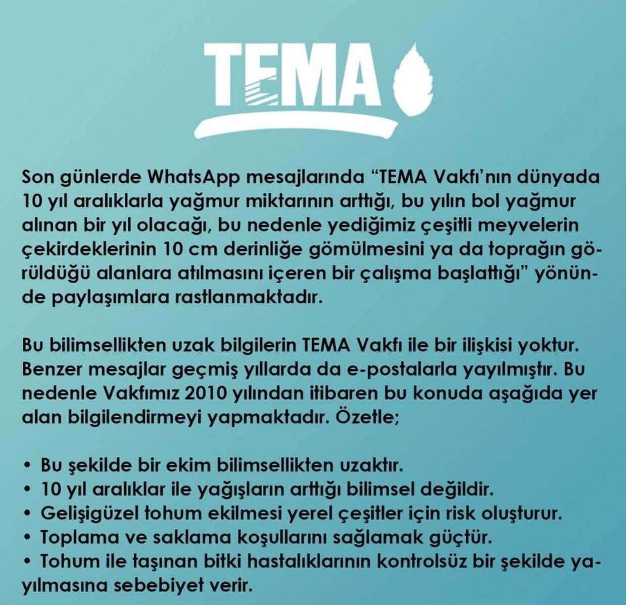 “Son günlerde internet ortamında, “Dünyada 10 yılda bir çok yağmur yağdığı, bu yıl o dönemde olduğumuz, yediğimiz çeşitli meyvelerin çekirdeklerinin çöpe atılmak yerine ekilmesi gerektiği, TEMA’nın desteği ile Türkiye genelinde meyve çekirdeklerinin toplandığını” belirten e-postalar dolaşmakta ve bu e-postalara dayanılarak basında haberler yayınlanmaktadır.
