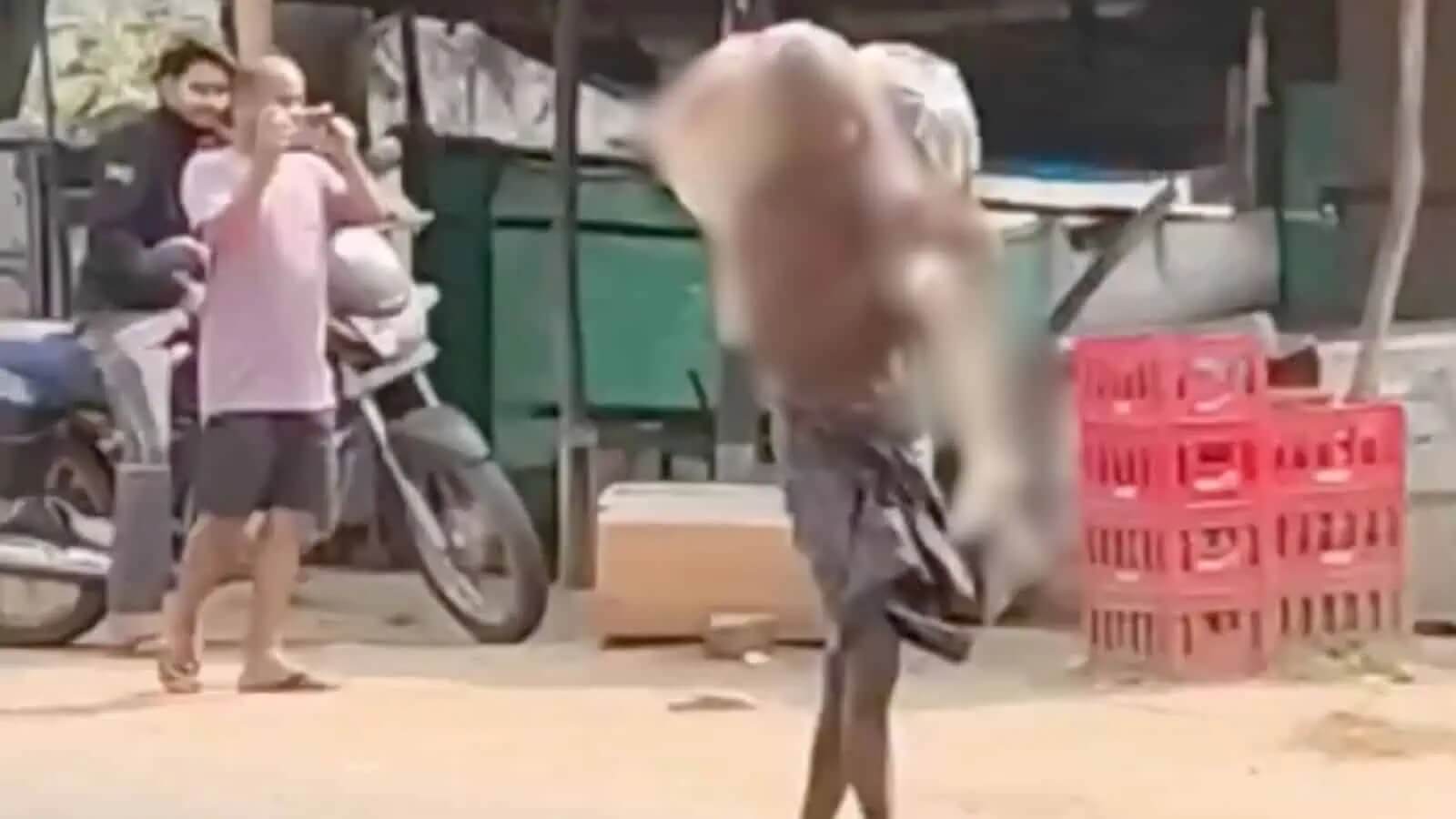 Üstsüz ve ayakkabısız bir erkeğin iskelet kalıntılarını bir şala sarılı halde sokakta taşıdığı görülen video şu şekilde: