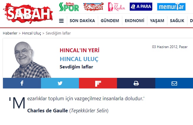 Sabah Gazetesindeki 3 Haziran 2012 tarihli köşesindeki “Sevdiğim Laflar” bölümünde Hıncal Uluç bu sözü Charles de Gaulle’e atfetmiş: