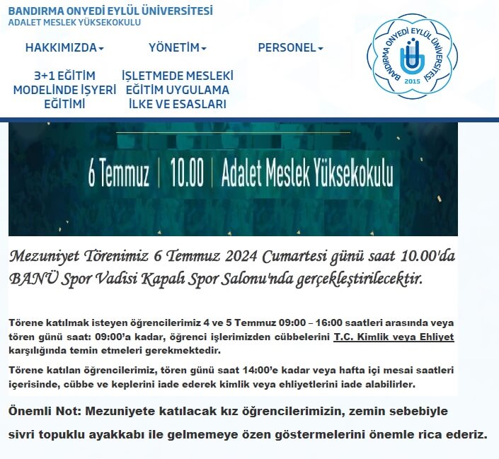 Mezuniyet Törenimiz 6 Temmuz 2024 Cumartesi günü saat 10.00’da BANÜ Spor Vadisi Kapalı Spor Salonu’nda gerçekleştirilecektir.