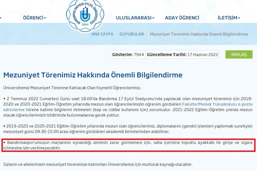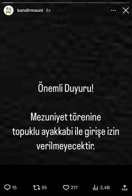 6 Temmuz 2024 günü sosyal medyada tepkiyle karşılanan iddiaya dair hazırladığımız içerikte, Bandırma 17 Eylül Üniversitesi mezuniyet törenlerinde sahanın zemini zarar görmesin diye topuklu ayakkabı giyilmesini talep ettiğini aktarmıştık.