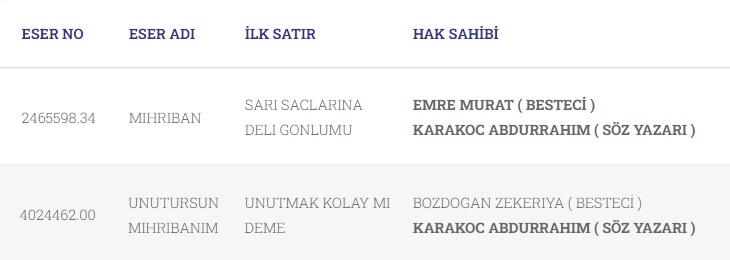 Türkiye Musiki Eseri Sahipleri Meslek Birliği (MESAM) veri tabanında adı geçen türkülerin söz yazarı ve besteci bilgileri şöyle sunulmuş: