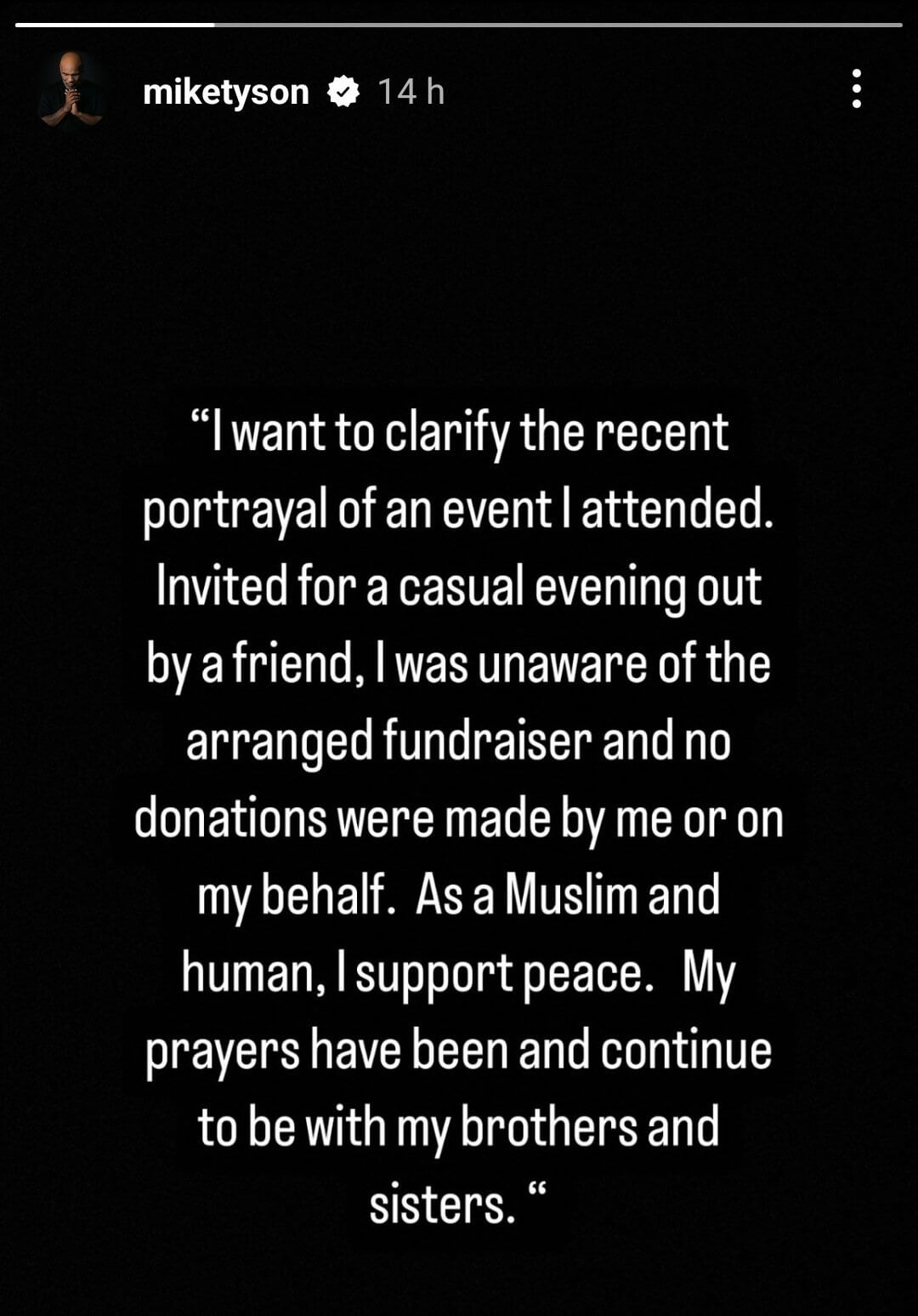 Mike Tyson ise katıldığı bir akşam yemeğinde İsrail ordusu için bağış organizasyonu düzenlendiğinden haberinin olmadığını, kendisi tarafından herhangi bir bağışın yapılmadığını söyledi.