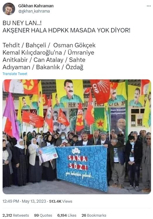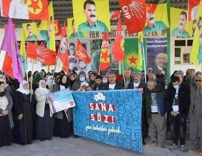 Terör örgütü PKK destekçisi grubun Millet İttifakı Cumhuriyet Halk Partisi (CHP) Genel Başkanı Kemal Kılıçdaroğlu’na destek verdiği anı yansıttığı iddiasıyla bir montaj görselin sosyal medya platformlarında servis edildiği görülüyor.