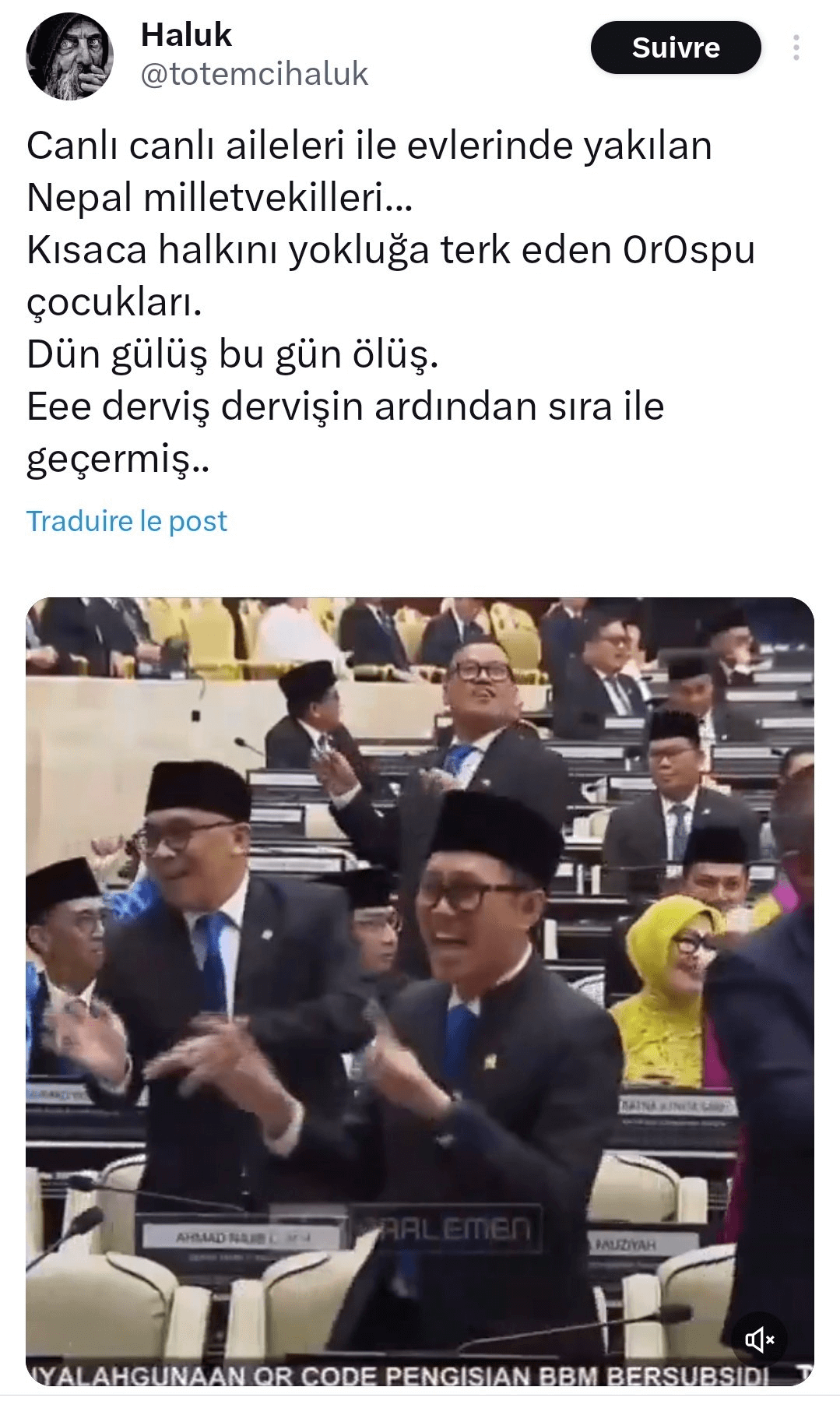 Haluk (@totemcihaluk): “Canlı canlı aileleri ile evlerinde yakılan Nepal milletvekilleri… Kısaca halkını yokluğa terk eden 0r0spu çocukları. Dün gülüş bu gün ölüş. Eee derviş dervişin ardından sıra ile geçermiş..”