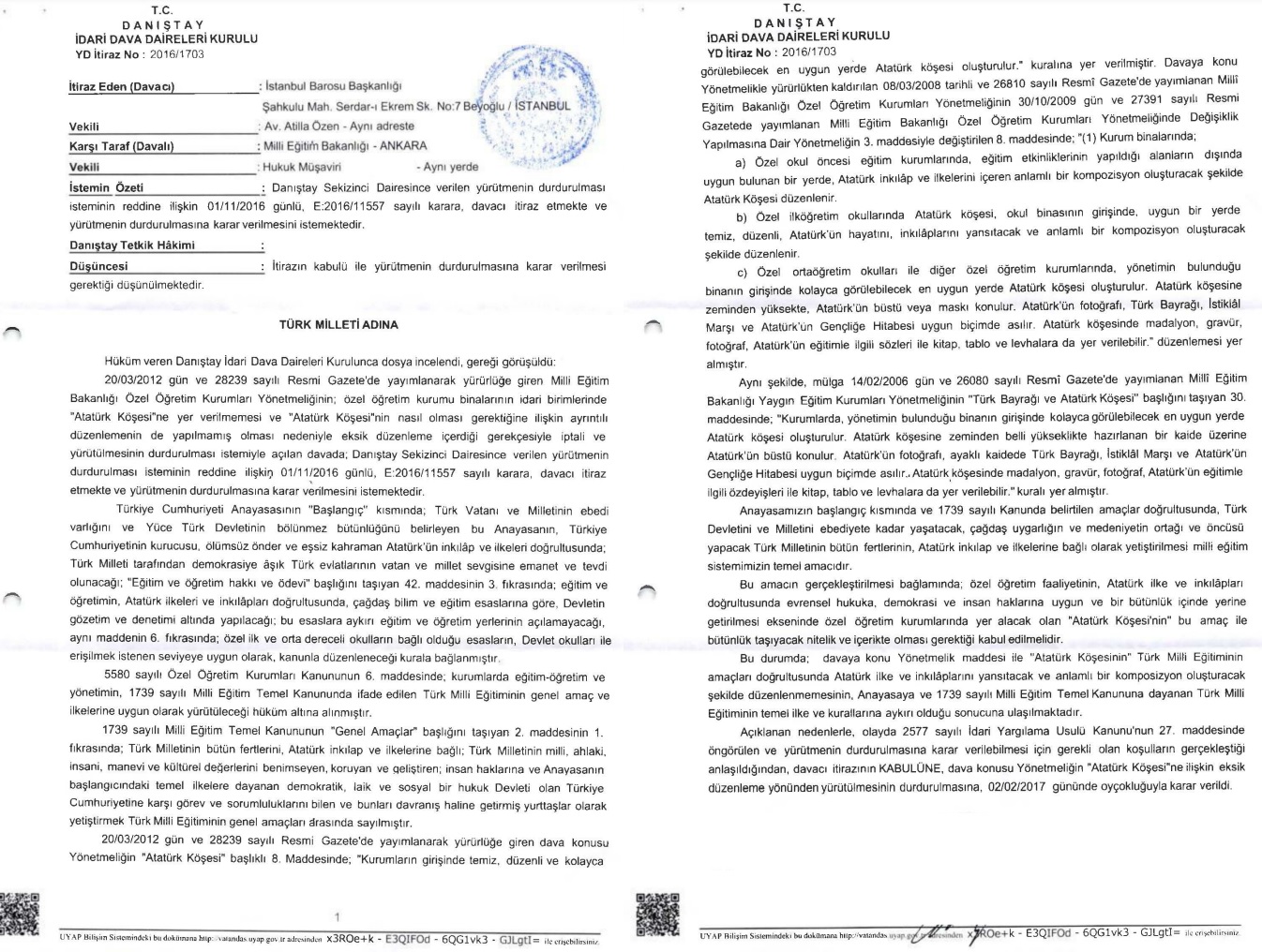 İstanbul Barosu Başkanlığı tarafından açılan iptal davasında, Danıştay 8. Dairesinin yürütmenin durdurulması isteminin reddi kararına karşı yapılan itiraz, Danıştay İdari Dava Daireleri Kurulu’nun 02.02.2017 gün ve 20162/1703 YD İtiraz No’lu kararı ile “Atatürk Köşesi”ne ilişkin eksik düzenlemenin yürütmesinin durdurulmasına karar verilmişti (Milli Eğitim Bakanlığının, bu kararın kaldırılması için İdari Dava Daireleri Kuruluna yaptığı başvuru reddedilmişti).