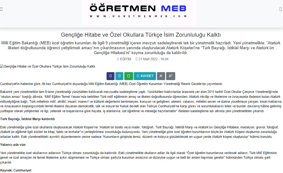 “MEB Özel eğitim kurumlarında uygulanmak istendi fakat 2012 yılında eğitim-iş sendikası olarak açtığımız dava neticesinde bu uygulama yapılamadı. 2015 yılında da yaygın eğitim kurumlarında aynı şeyi yapmak istediler. Atatürk köşesi, İstiklâl Marşı, Atatürk’ün Gençliğe Hitabesi kaldırılmak istendi. Bunun sonucunda biz tekrar dava açtık ve davayı kazandık. Uygulamaya girilmedi. Haber aslında geriye dönük bir haber. Eğitim-iş sendikasının kazandığı ve kaldırılmasının mümkün olmadığı bir haber. Şu an bu konu sosyal medyaya tekrar düştü ama yeni bir haber değil. Bazı sayfalar Cumhuriyet gazetesinden alarak bunu paylaşmışlar. Cumhuriyet gazetesiyle de konuştuk. Kendileri de 2012 yılında yayınladıkları bir haber olduğunu ifade ettiler.”