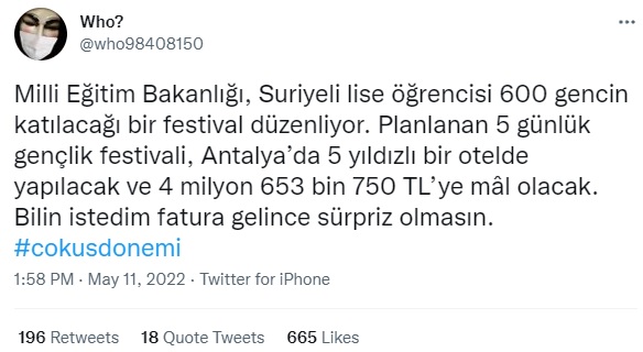 Anadolu Fest gibi bazı etkinlikler iptal edilirken, Milli Eğitim Bakanlığı tarafından Suriyeli gençler için 5 yıldızlı otel konaklamalı 5 günlük Gençlik Festivali düzenleyeceği haberi sosyal medyada tepkiyle karşılandı.