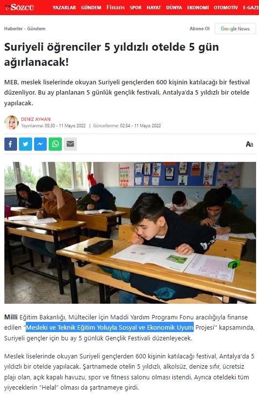 Gündeme düşen bu iddianın kaynağı Sözcü’den Deniz Ayhan’ın “Suriyeli öğrenciler 5 yıldızlı otelde 5 gün ağırlanacak!” başlıklı haberiydi.
