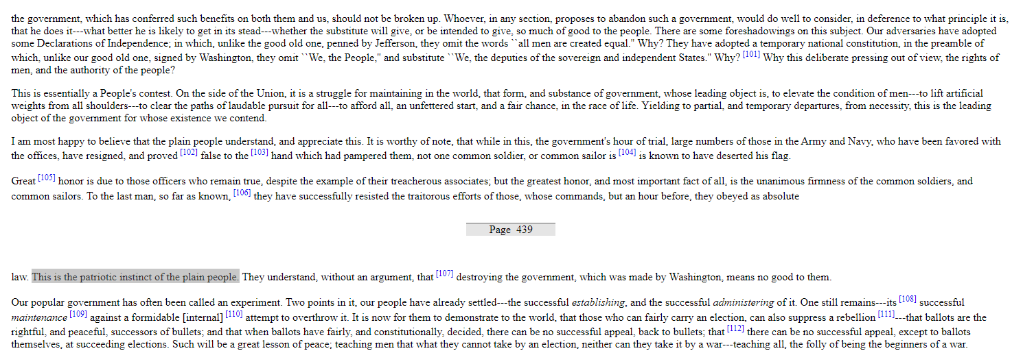 1861 – 1865 yılları arasında süren ABD İç Savaşı esnasında Vaşington hükümetine bağlı kalan “normal” vatandaşlarının sadakatine değindiği “Bu, sıradan insanların vatanseverlik içgüdüsüdür. Vaşington’da kurulmuş olan hükümeti yıkmanın kendilerine bir faydası olmayacağını hiç şüphesiz anlıyorlar.” sözünü kullandığı konuşmanın ilgili kısmı şöyle: