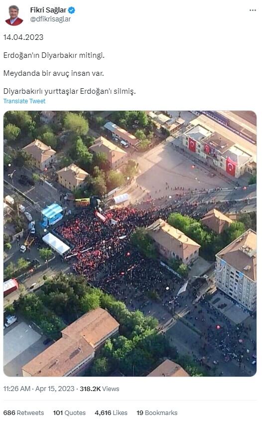 Fikri Sağlar: “14.04.2023 Erdoğan’ın Diyarbakır mitingi. Meydanda bir avuç insan var. Diyarbakırlı yurttaşlar Erdoğan’ı silmiş.”