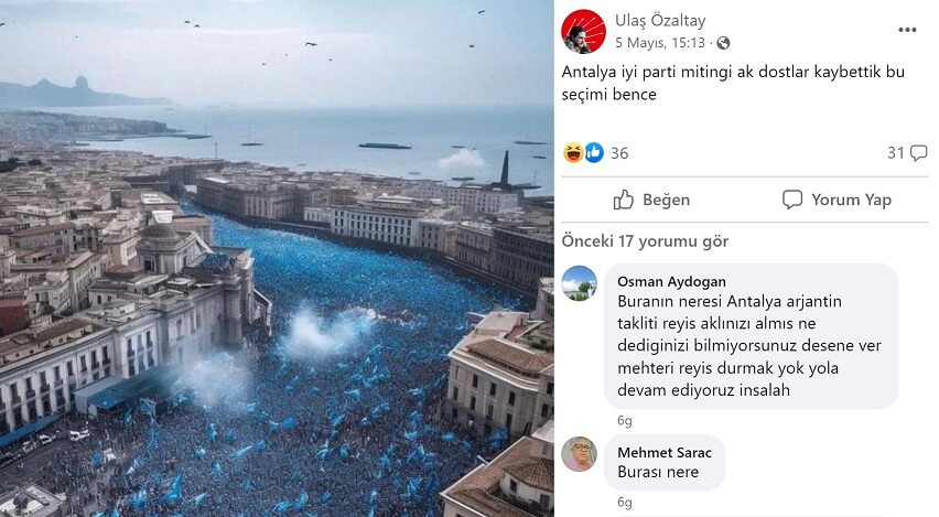 İYİ Parti’nin Bursa & Antalya mitingine ait olduğu iddiasıyla paylaşılan görsel yapay zekâ programı kullanılarak hazırlanmış.