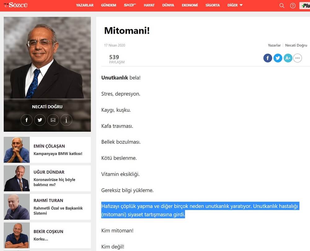 Sözcü Gazetesi yazarı Necati Doğru 17 Nisan 2020 tarihli “Mitomani!” başlıklı yazısında yalan söyleme hastalığı olarak bilinen “mitomani”yi “unutkanlık” hastalığı olarak tanımlamış ve yazısının tamamını unutkanlık üzerine kurgulamış.