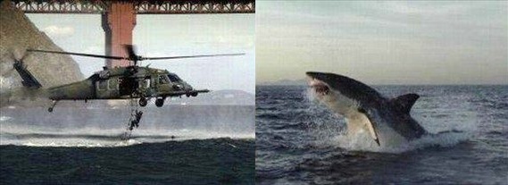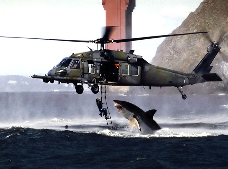 Sanal dünyanın en ünlü sahte fotoğraflarından biri, askerî helikopterden uzatılmış merdivene tırmanan dalgıca köpekbalığı saldırırken çekildiği sanılan montaj görsel olabilir…