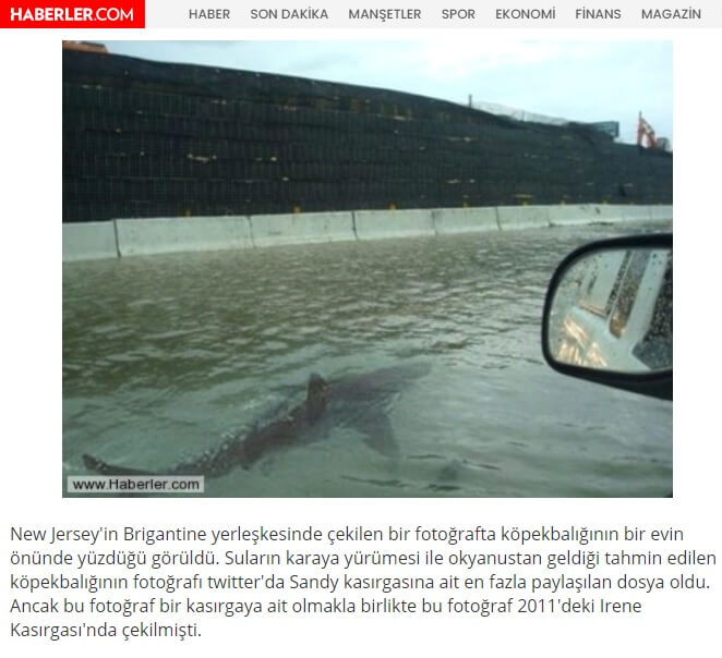 “New Jersey’in Brigantine yerleşkesinde çekilen bir fotoğrafta köpekbalığının bir evin önünde yüzdüğü görüldü. Suların karaya yürümesi ile okyanustan geldiği tahmin edilen köpekbalığının fotoğrafı twitter’da Sandy kasırgasına ait en fazla paylaşılan dosya oldu. Ancak bu fotoğraf bir kasırgaya ait olmakla birlikte bu fotoğraf 2011’deki Irene Kasırgası’nda çekilmişti.”