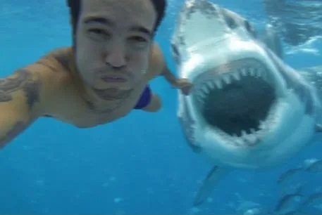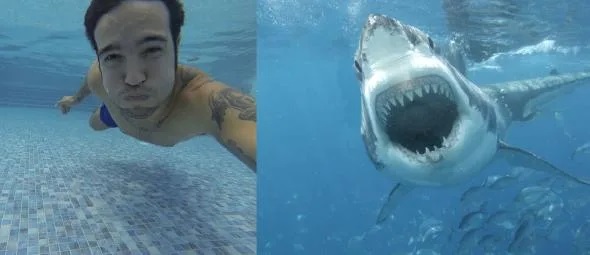 “Köpekbalığı saldırısına uğramadan önce son özçekim” tanımıyla paylaşılan görsel de Fall Out Boy grubunun basçısı ve söz yazarı Pete Wentz’in havuzdaki fotoğrafı kullanılarak oluşturulmuş.